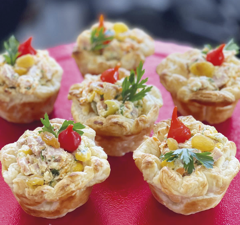 12 discos de massa de pastel, 2 e 1/2 xícaras de tender (picado em cubinhos), 1 cenoura (ralada), 1/2 lata de milho (em conserva), azeitonas picadas (a gosto), azeite (a gosto), sal (a gosto), 300 gramas de cream cheese, cheiro verde (a gosto) e para decorar uvas passas (opcional).