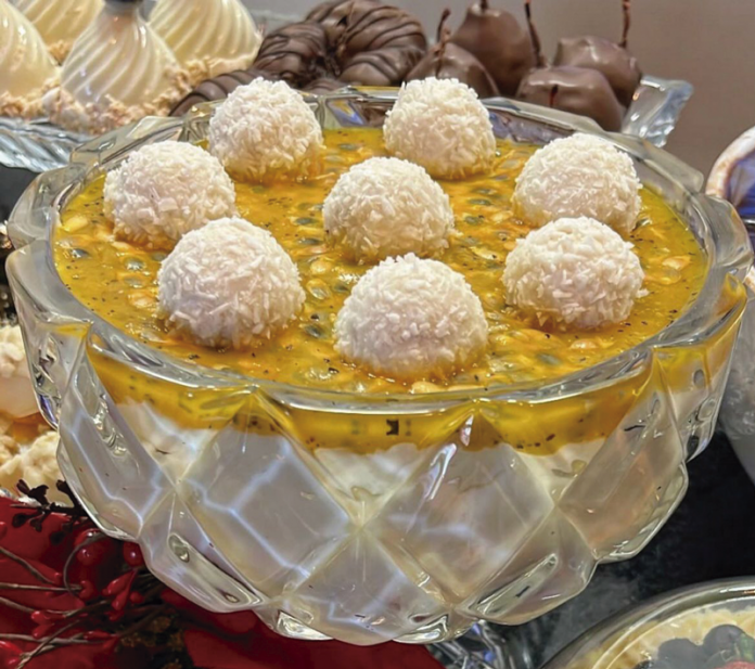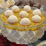 Para o manjar de Raffaello: 1 litro de leite integral, 1 leite condensado, 2 caixinhas de creme de leite, 130 gramas de amido de milho, 200 gramas de leite de coco, 200 gramas de coco ralado úmido e adoçado, 500 gramas de chocolate branco derretido e 4 raffaelos picados.
