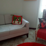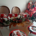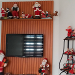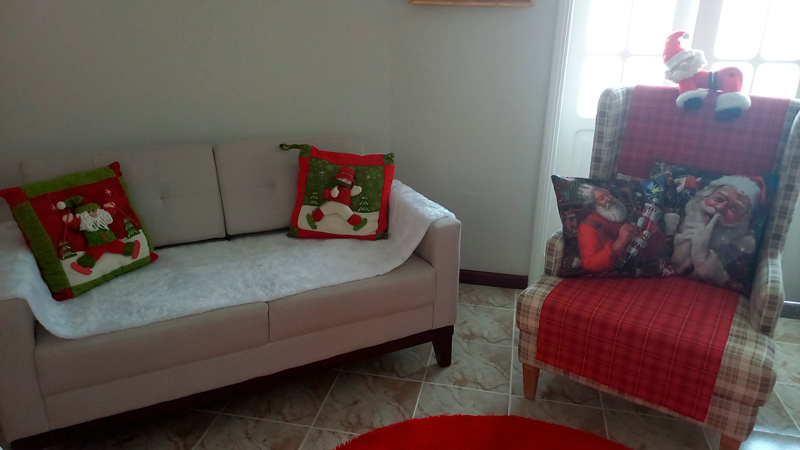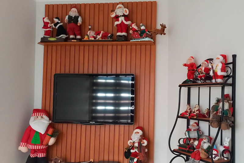 A figura do Papai Noel estampa almofadas pelos sofás, nas toalhas do banheiro, no tapete e até na capa do vaso sanitário. Muitos bonequinhos do Bom Velhinho enfeitam prateleiras, painéis e preenchem toda a cristaleira da família. Na sala de jantar, o casal Noel ocupa um aparador no canto, enquanto a mesa principal tem jogos americanos estampados com o Papai Noel, que também é representado em um bonequinho que serve como porta-guardanapos.