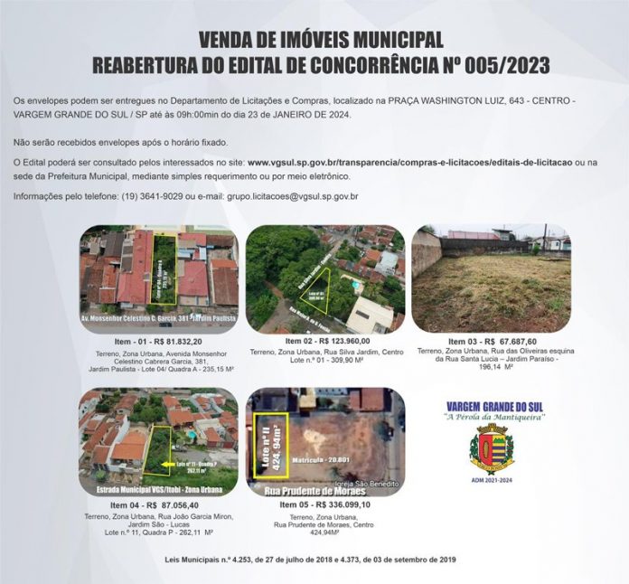 Os interessados têm até terça-feira, dia 23, às 9h, para entregar a documentação do edital de concorrência nº 005/2023 para a venda de cinco terrenos, localizados em vários bairros da cidade. A entrega deve acontecer no Departamento de Licitações da Prefeitura Municipal. A modalidade é concorrência do tipo maior oferta.