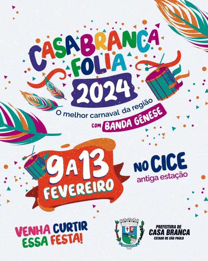 O Casa Branca Folia 2024 será realizado de 9 a 13 de fevereiro no CICE (antiga estação). Para agitar o carnaval na Capital Estadual da Jabuticaba, haverá matinês para Melhor Idade e para a criançada e a noite, show com a Banda Gêneses em todos os dias.