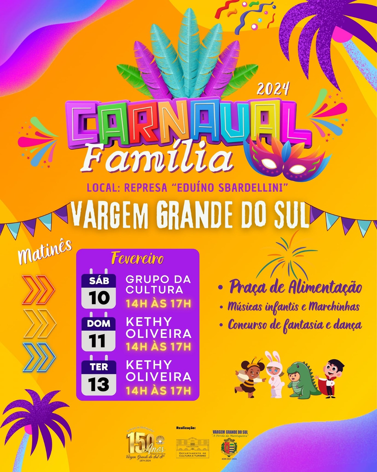 Para comemorar o Carnaval, a Prefeitura Municipal, através do Departamento de Cultura, está organizando a realização de três matinês, na Represa Eduíno Sbardellini. O evento será no sábado, dia 10, domingo, dia 11, e na terça-feira de Carnaval, dia 13, entre as 14h e 17h.