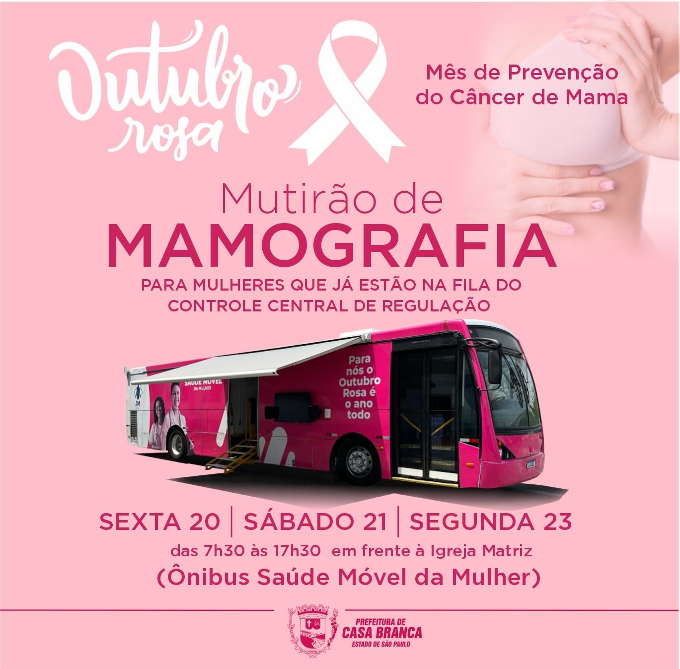 A Prefeitura Municipal de Casa Branca está realizando um final de semana de mutirão de mamografia, em apoio à Campanha Outubro Rosa, que visa conscientizar as mulheres da importância de se prevenir quanto ao câncer de mama.