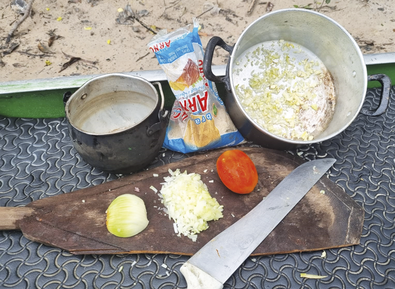 Terça-feira, dia 16, começamos a retornar. A distância de Santa Isabel a Barcelos é de 240km, que tínhamos de vencer no barco com um motor de 30hp, tempo que o Bigode calculava em três dias. Logo que amanhecia, o Bigode já fazia o café, cozinhava e fritava uns ovos, que comíamos com pão e partíamos para a pesca.