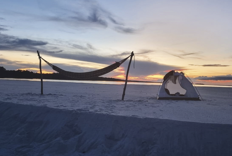 Pescávamos até o entardecer, quando então pegava um peixe menor para fazer assado ou frito. Eu fazia o arroz e o vinagrete, o Bigode assava o peixe e depois montávamos acampamento, escolhendo uma bela praia. Eu dormia em uma barraca e meu guia na sua rede, acostumado que estava. As noites são incríveis. Sem a claridade das cidades, o céu no Rio Negro quando escurece, nos presenteia com uma infinidade de estrelas que brilham com todo o esplendor, mostrando inúmeras constelações que não conseguimos avistar nas nossas cidades. Algo que ficará imorredouro na minha mente.