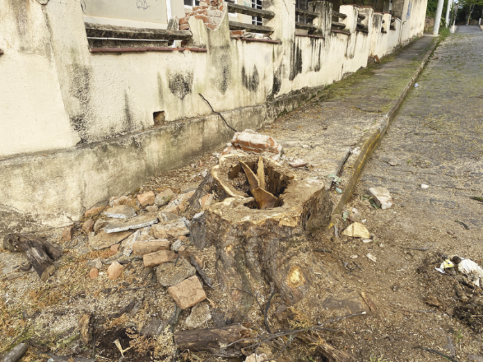 Outra árvore fotografada pelo jornal, é uma sibipiruna antiga, plantada no jardim da Escola Benjamin Bastos, que morreu. Também foi verificado o corte de três grandes sibipirunas que foram cortadas na semana passada na esquina da Escola Alexandre Fleming, ficando somente o toco das mesmas.
