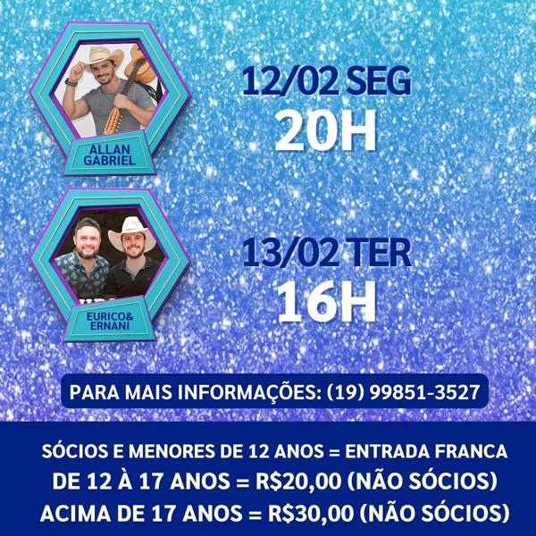 No domingo, dia 11, a festa inicia às 16h, com apresentação de Ruan Augusto. Na segunda, dia 12, Allan Gabriel se apresenta às 20h. Na terça-feira de Carnaval, dia 13, Eurico & Ernani sobem ao palco às 16h.