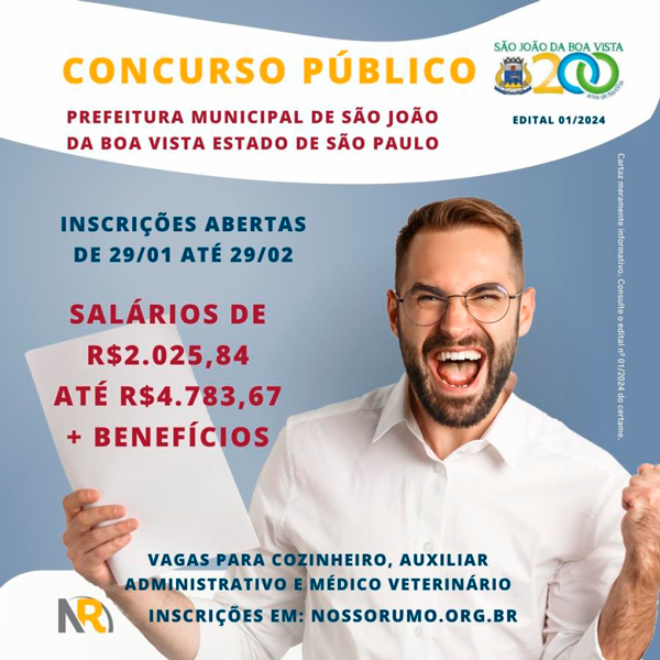 Estão abertas desde o dia 29 de janeiro, as inscrições para o concurso público da Prefeitura Municipal de São João da Boa Vista. Os candidatos podem se inscrever até as 23h59 do dia 29 de fevereiro, através do site da instituição Novo Rumo, www.nossorumo.org.br, a organizadora do certame.