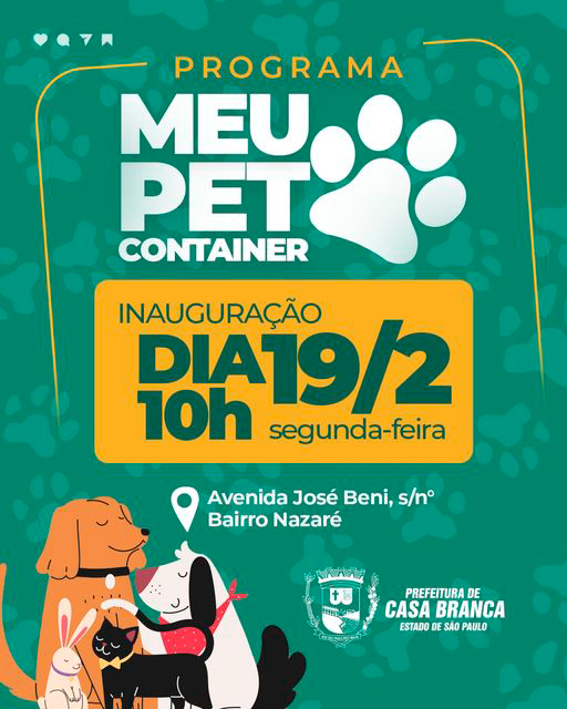 O Programa Meu Pet Container de Casa Branca, que visa promover atendimentos ambulatoriais a cães e gatos em casos de baixa e média complexidade, está programado para ser inaugurado nesta segunda-feira, dia 19, conforme divulgado nas redes sociais.