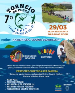 O Departamento de Agricultura e Meio Ambiente está preparando o 7º Torneio de Pesca promovido pela Prefeitura de Vargem Grande do Sul. O evento será realizado na Sexta-Feira Santa, dia 29, a partir das 6h e vai até às 11h30. Para o torneio, foram comprados Tilápias adultas e Patingas e, de acordo com o informado, não será permitida a pesca antes do horário previsto.