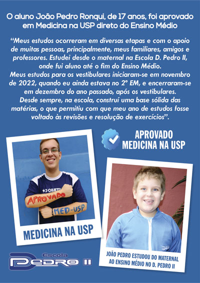Com apenas 17 anos de idade, o jovem João Pedro Ronqui, filho de Josaine Cristina Pedro Ronqui e do empresário Gustavo Ronqui, foi aprovado no vestibular da Fuvest para o curso de medicina em uma das mais respeitadas faculdades do país. João Pedro se prepara para residir em São Paulo e cursar medicina na USP – Pinheiros. O jovem recebe os parabéns de familiares e amigos pela conquista
