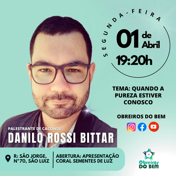 Na ocasião, uma segunda-feira, haverá uma palestra às 19h20, com o tema ‘Quando a pureza estiver conosco’, com o palestrante, Danilo Rossi Bittar, de Caconde. Para abrir o evento, haverá a apresentação do Coral Sementes de Luz.