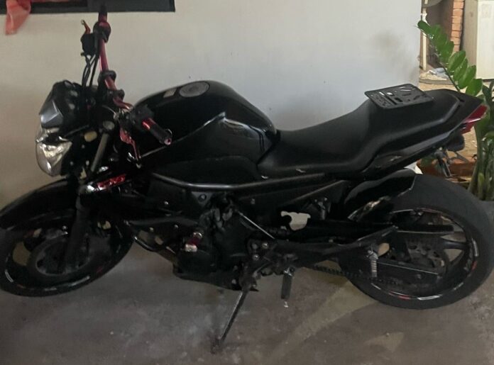 Em sua residência foi encontrada a motocicleta com a numeração de chassi parcialmente suprimida e sem a placa de identificação, porém com a numeração de motor intacta. Pela numeração, foi verificado que era uma motocicleta roubada em Araras (SP) em 26 de março de 2023, conforme boletim de ocorrência.