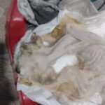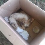 Quando chegou, viu o cachorro já com varejeira e fedendo, com apenas um travesseiro. Com a maneira que as mulheres jogaram a caixa, o cachorrinho caiu e estava prestes a cair no escoamento de água de rua no local.