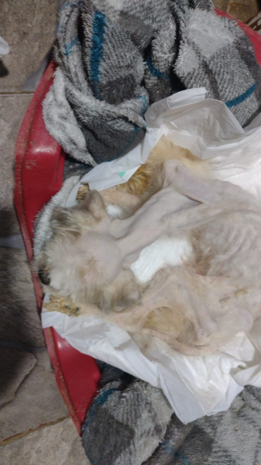 Quando chegou, viu o cachorro já com varejeira e fedendo, com apenas um travesseiro. Com a maneira que as mulheres jogaram a caixa, o cachorrinho caiu e estava prestes a cair no escoamento de água de rua no local.