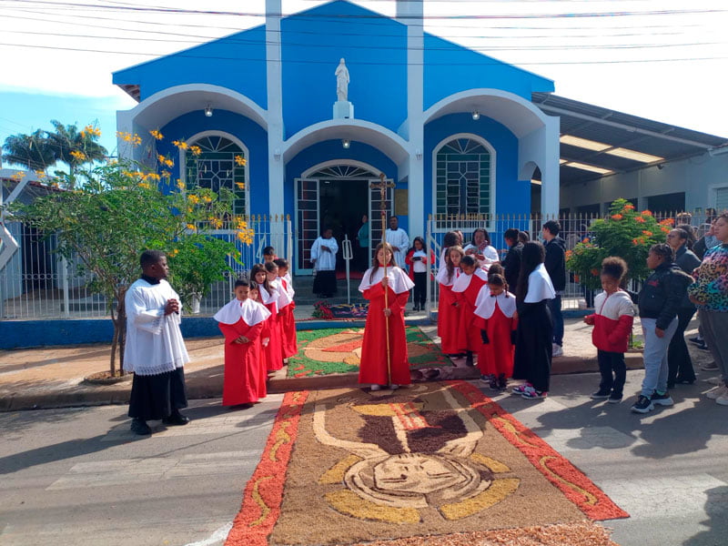 Na Paróquia São Joaquim, a missa em celebração foi às 8h e a procissão ocorreu em volta da igreja. O tapete foi preparado pelas crianças da catequese, que fizeram cartazes para colocar no tapete onde Jesus iria passar