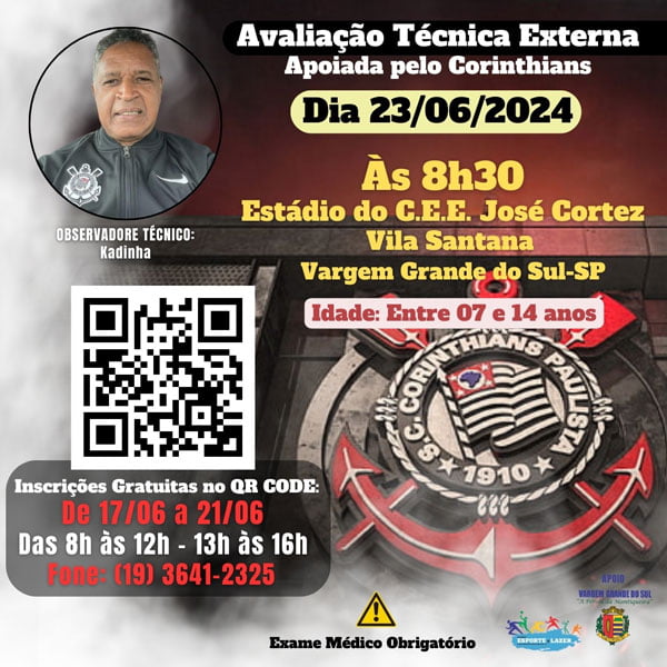 A avaliação técnica, a conhecida peneira, do Sport Club Corinthians em Vargem Grande do Sul será neste domingo, dia 23, no CEE José Cortez, às 8h30. Serão avaliados jovens entre 7 e 14 anos que praticam futebol em Vargem Grande do Sul e se inscreveram para participar.
