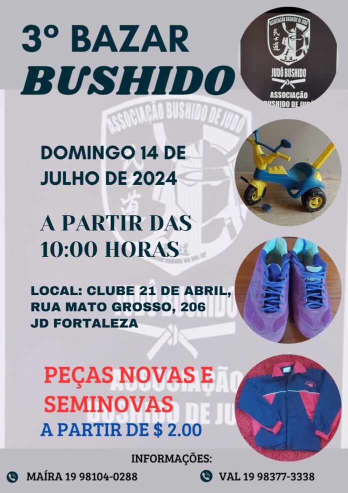O Bazar Bushido, em prol das crianças da Associação Bushido de Judô, será realizado neste domingo, dia 14, no Clube XXI de Abril, a partir das 10h. As peças novas e semi-novas serão vendidas no bazar a partir de R$ 2,00, até R$ 20,00.