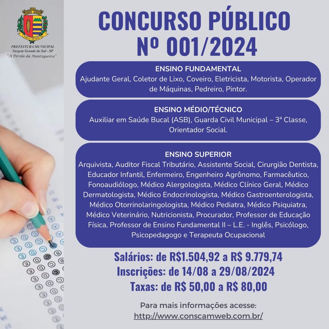 O edital do Concurso Público nº 001/2024 para diversos cargos públicos efetivos pela Prefeitura Municipal de Vargem Grande do Sul, foi divulgado no dia 22. As inscrições serão realizadas de 14 a 29 de agosto, através do site www.conscamweb.com.br. Os salários são de R$ 1.504,92 a R$ 9.779,74 e as taxas de inscrições são de R$ 50,00 a R$ 80,00.