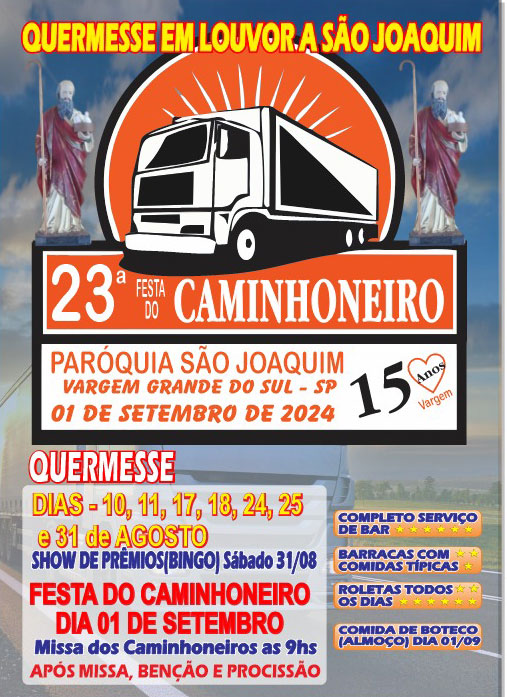 A aguardada Festa do Caminhoneiro da paróquia chega este ano em sua 23ª edição. Com missa na Igreja Matriz de São Joaquim, a festa acontece neste domingo, dia 1º de setembro, às 9h.