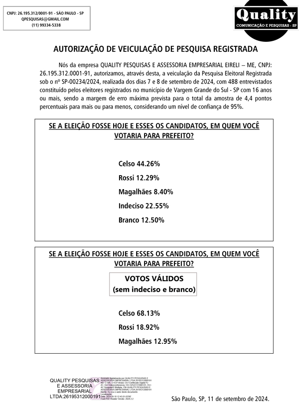 Já a pesquisa realizada pela Quality Pesquisas e Assessoria Empresarial Eireli-ME, nos dias 7 e 8 de setembro de 2024, com 488 entrevistados com 16 anos ou mais, aponta uma margem de erro de 4,4 pontos percentuais para mais ou para menos, considerando um nível de confiança de 95%.