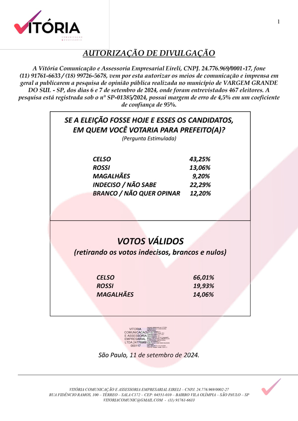 Duas pesquisas eleitorais realizadas em Vargem Grande do Sul entre os dias 6, 7 e 8 de setembro, mostram o candidato Celso Ribeiro (Republicanos), que tem como vice Guilherme Nicolau (MDB) liderando as intenções de voto entre os entrevistados para as eleições municipais de 6 de outubro. As pesquisas foram feitas pelas empresas Quality Pesquisas e Assessoria Empresarial Eireli-ME, registrada na Justiça Eleitoral sob o nº SP-00234/2024 e pela empresa Vitória Comunicação e Assessoria Empresarial Eireli-ME, registrada sob o n° SP-01385/2024.
