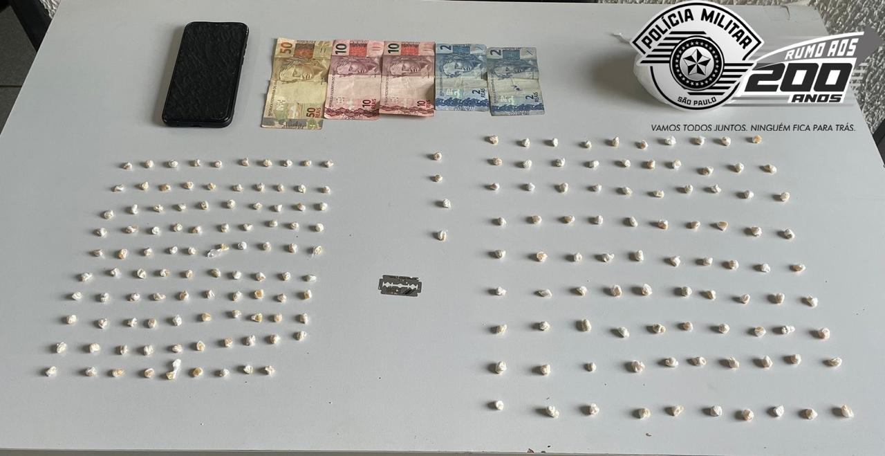 Um dos rapazes, conhecido como ‘branquinho’, entregou algo ao outro rapaz, que guardou no bolso da bermuda. Ambos tentaram fugir de bicicleta. Um dos rapazes foi abordado, sendo localizado um kit com 97 pedras de crack prontas para venda em seu bolso.