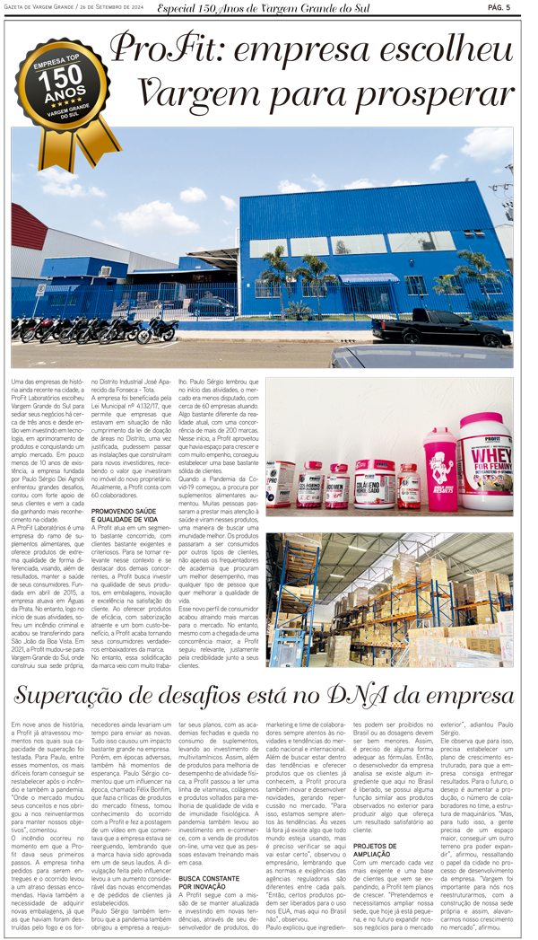 Uma das empresas de história ainda recente na cidade, a ProFit Laboratórios escolheu Vargem Grande do Sul para sediar seus negócios há cerca de três anos e desde então vem investindo em tecnologia, em aprimoramento de produtos e conquistando um amplo mercado. Em pouco menos de 10 anos de existência, a empresa fundada por Paulo Sérgio Dei Agnoli enfrentou grandes desafios, contou com forte apoio de seus clientes e vem a cada dia ganhando mais reconhecimento na cidade.