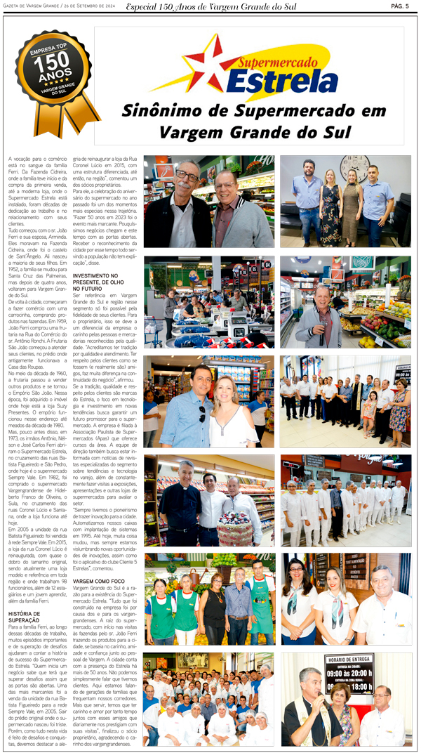 Vargem Grande do Sul é a razão para a existência do Supermercado Estrela. “Tudo que foi construído na empresa foi por causa dos e para os vargengrandenses. A raiz do supermercado, com início nas visitas às fazendas pelo sr. João Ferri trazendo os produtos para a cidade, se baseia no carinho, amizade e confiança junto ao pessoal de Vargem. A cidade conta com a presença do Estrela há mais de 50 anos. Não podemos simplesmente falar que tivemos clientes. Aqui estamos falando de gerações de famílias que frequentam nossos corredores. Mais que servir, temos que ter carinho e amor por tanto tempo juntos com esses amigos que diariamente nos prestigiam com suas visitas”, finalizou o sócio proprietário, agradecendo o carinho dos vargengrandenses.