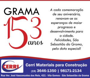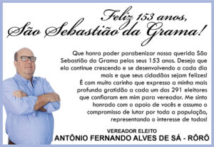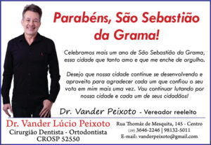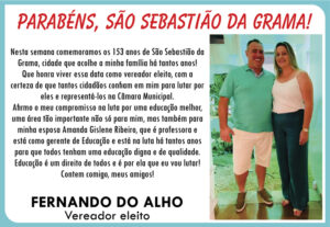 Aproveitando a reportagem do jornal, Zé da Doca parabenizou São Sebastião da Grama pelos seus 153 anos de fundação. “Agradeço a todos que confiaram em nosso trabalho, no meu e do meu vice Pio Leiteiro. Vamos corresponder a todos estes votos que recebemos, trabalhando dia a dia para o nosso município. Eu amo São Sebastião da Grama”, finalizou.