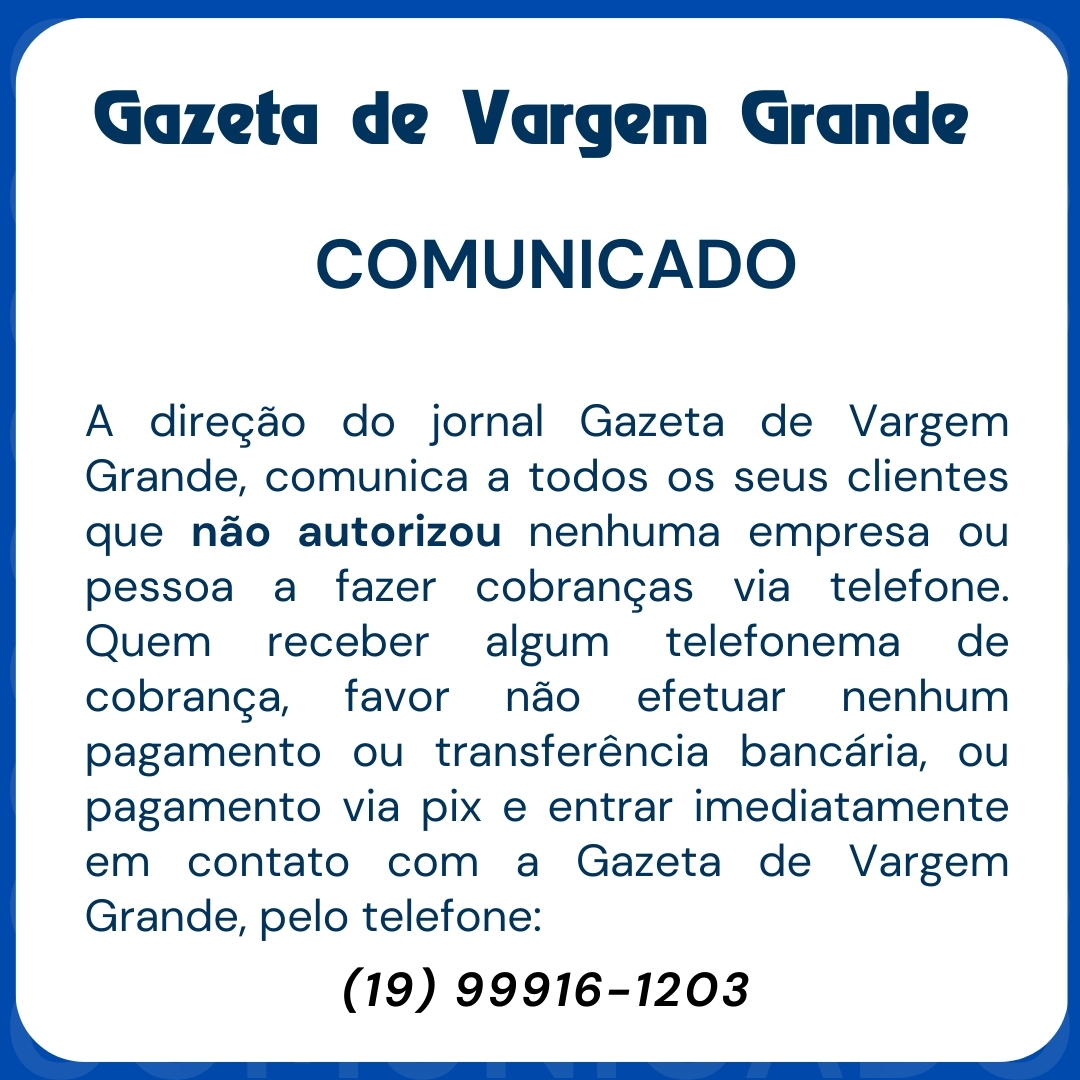 Quem receber algum telefonema de cobrança, favor não efetuar nenhum pagamento ou transferência bancária, ou pagamento via pix e entrar imediatamente em contato com a Gazeta de Vargem Grande, pelo telefone (19) 99916-1203.