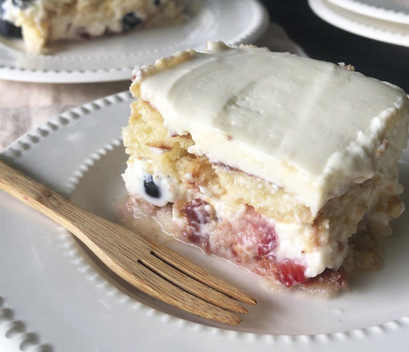 250 gramas de bolacha champanhe, 1,5 copo de leite morno, geleia de frutas vermelhas, 1 caixa de morango, 100 gramas de blueberry (você pode usar também uvas, cerejas…)