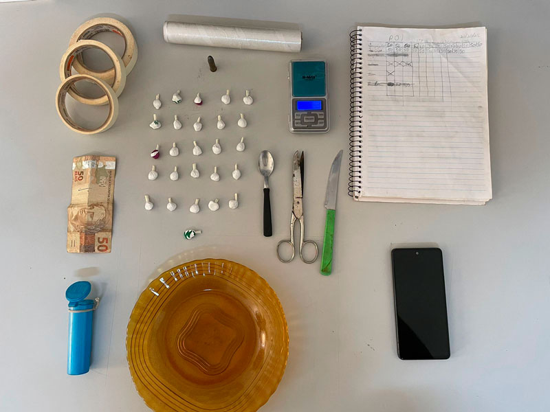 Em um quarto localizado nos fundos da casa, os policiais encontraram 26 porções de cocaína, uma balança de precisão, utensílios com resíduos de droga, materiais utilizados para embalagem, como rolos de fita crepe e plástico filme, além de anotações relacionadas ao tráfico. No quarto do rapaz, também foram apreendidos R$ 50,00 em dinheiro e um aparelho celular. Na cozinha, dentro de uma meia escondida sob a pia, foi localizada uma munição intacta de revólver calibre 38.