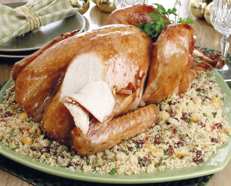 Para o peru: Peru, 2 limões, 3 pedaços de canela, 6 cravos da Índia, sal, 3 dentes de alho, cebola, pimenta, óleo, manteiga, champanhe, farinha de trigo, laranja