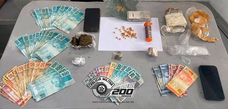 No veículo que pertence ao segundo suspeito, os policiais encontraram uma porção de maconha embalada e pronta para a venda, além de R$ 667,00 em cédulas. Já na casa abandonada onde o trio foi visto entrando, os PMs encontraram uma balança de precisão sobre a pia, além de um pote contendo 46 pedras de crack, uma embalagem com fragmentos da mesma droga, uma pedra bruta de crack, uma porção grande de maconha e diversas embalagens plásticas comumente utilizadas para embalar drogas.