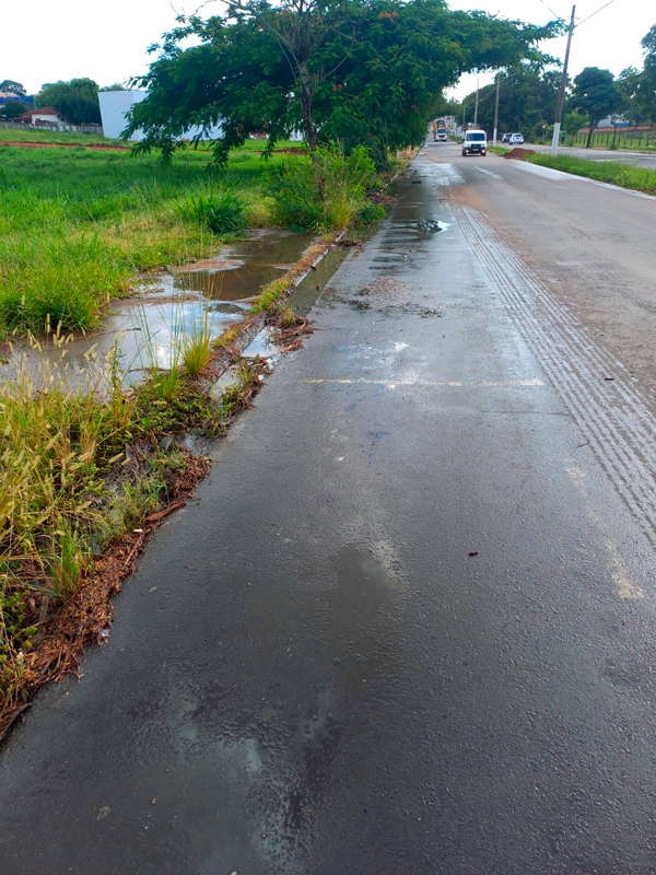 Com as chuvas, água de esgoto tem se espalhado pela Av. Bolonha