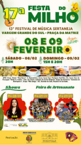 A tradicional Festa do Milho, que chega em sua 17ª edição, e o 13º Festival de Música Sertaneja serão realizados neste sábado, dia 8, e neste domingo, dia 9, na Praça Capitão João Pinto Fontão, a Praça da Matriz. O evento foi organizado pelo Departamento de Cultura e Turismo de Vargem Grande do Sul.