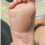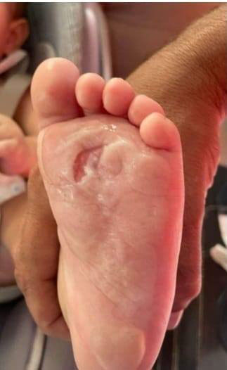Devido às altas temperaturas dos últimos dias, uma placa de ferro no chão atingiu temperaturas elevadas. Sem perceber o risco, o bebê pisou na superfície superaquecida e sofreu queimaduras severas nos dois pés.
