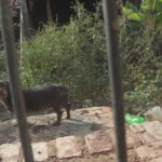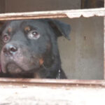 Através de um vitrô quebrado é possível ver um outro cachorro coberto por sarna. Os cachorros estão sendo alimentados pelos vizinhos que jogam a comida no chão ou pelo vitrô.
