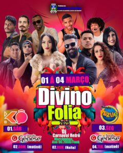 Em Divinolândia acontece o Divinofolia, na Rua 7 de setembro. Neste sábado, dia 1º, quem se apresenta é a Banda K.O. Neste domingo, dia 2, tem matinê com a Banda Gênese e, à noite, DJ Carnaval Retrô com marchinhas, axé anos 90/00 e funk.