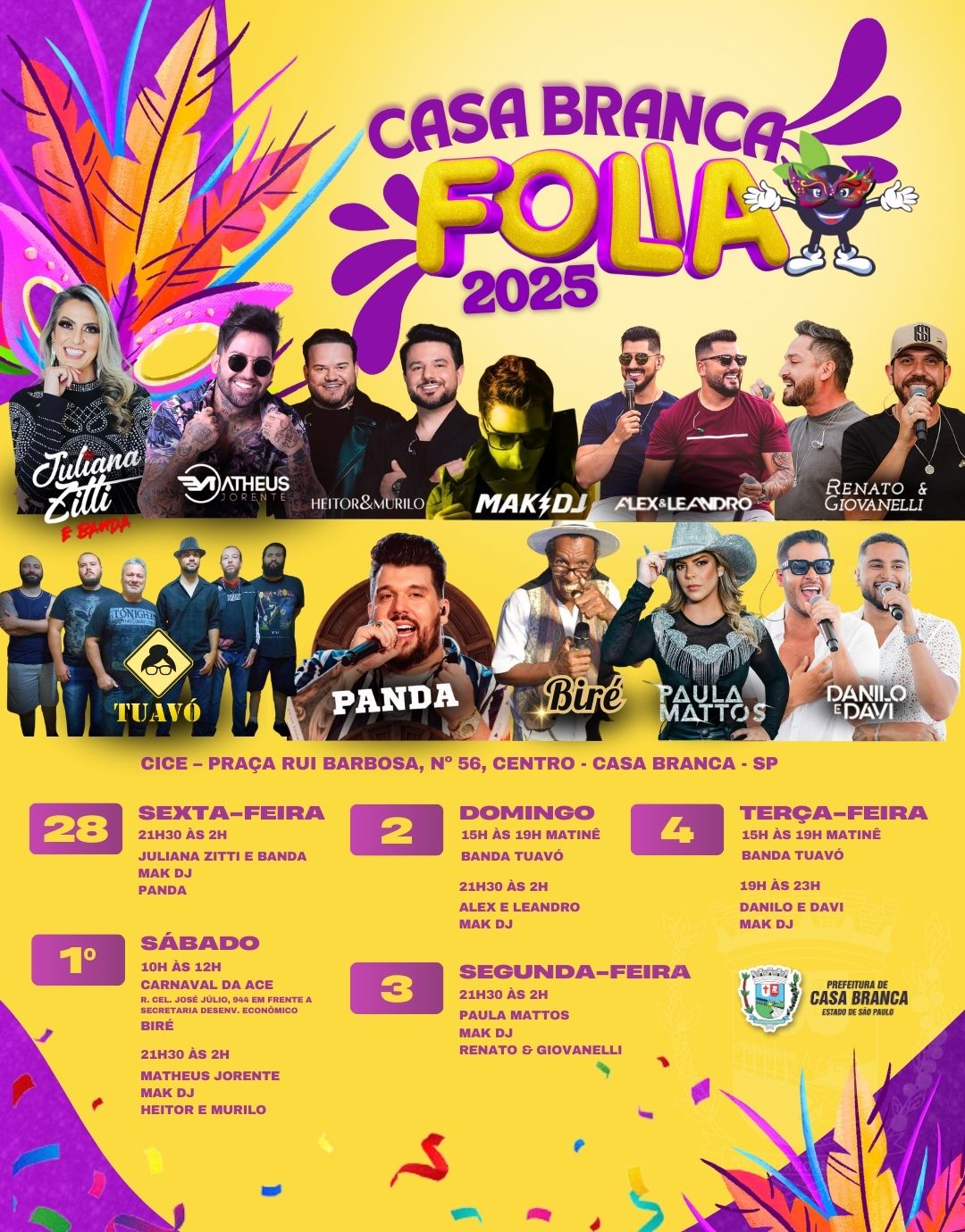 A folia em Casa Branca começa nesta sexta-feira, dia 28, no CICE, à Praça Rui Barbosa, nº 56, no Centro, com Juliana Zitti e Banda, Mak DJ e Panda.