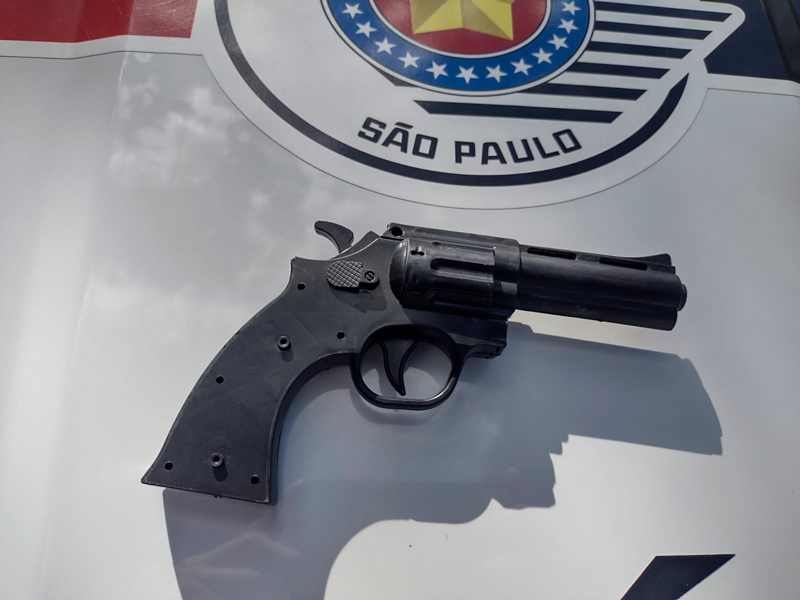 Diante da atitude suspeita do homem, a equipe decidiu realizar uma abordagem. Durante a revista, nada de ilícito foi encontrado com o rapaz, que foi identificado. No entanto, ao verificar o objeto escondido sobre a mesa, os policiais constataram que se tratava de um simulacro de revólver, feito de plástico e pintado de preto, com 19 cm de comprimento.