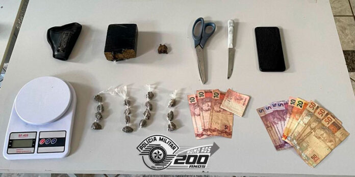 A equipe então se dirigiu até o endereço indicado, onde foram recebidos pela mãe do adolescente e pelo padrasto, que autorizaram a busca no imóvel. Na cozinha da residência, os policiais localizaram um tijolo de maconha, uma porção de maconha sem embalagem, uma balança de precisão, uma faca com resíduos de drogas, uma tesoura e a carteira do padrasto, que continha R$ 205,00 e documentos pessoais. Em continuidade à busca, no quarto do adolescente, foi encontrado um coldre de revólver em cima do guarda-roupas.
