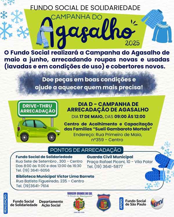 O Fundo Social de Solidariedade deu início à Campanha do Agasalho 2025, que ocorrerá entre os meses de maio e junho, com o objetivo de arrecadar roupas novas e usadas, em bom estado de conservação, além de cobertores novos, destinados às pessoas em situação de vulnerabilidade social.