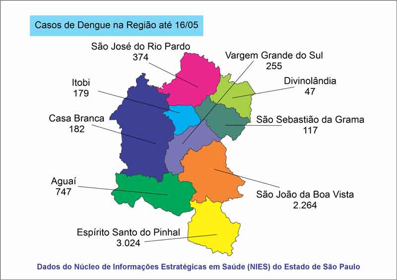 Os casos de dengue em Vargem Grande do Sul chegaram a 255 nesta sexta-feira, dia 16 de maio, de acordo com os dados do Núcleo de Informações Estratégicas em Saúde (NIES) do Estado de São Paulo. Segundo o boletim, apenas três casos estão sinalizados como sinal de alarme e 558 notificações foram descartadas. Sete casos estão em investigação e dois óbitos estão sendo investigados.