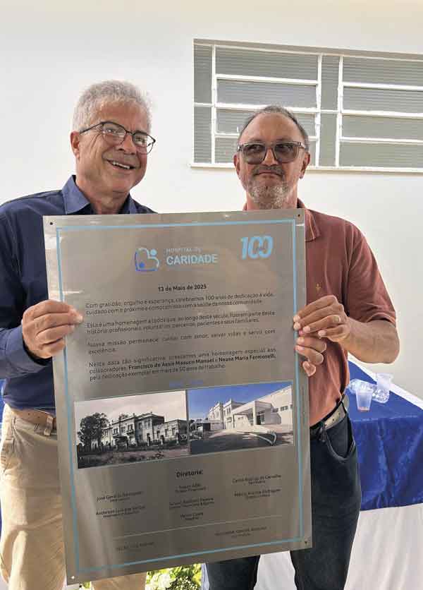 Por último, foi feita uma homenagem especial aos colaboradores do Hospital de Caridade, o administrador Francisco de Assis Masuco Manoel e à funcionária Neusa Maria Fermoselli, por seus mais de 50 anos de trabalho na instituição.