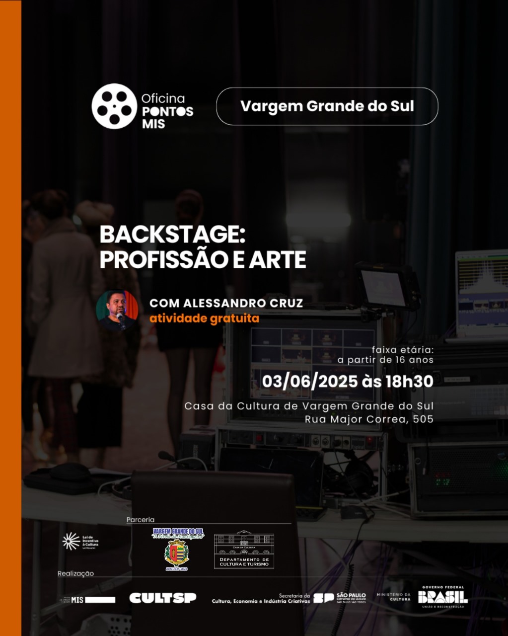 O Departamento de Cultura e Turismo da Prefeitura de Vargem Grande do Sul, em parceria com o Ponto MIS (Museu da Imagem e do Som), promoverá nesta terça-feira, dia 3 de junho, às 18h30, a oficina “Backstage: Profissão e Arte”, voltada para quem deseja aprender mais sobre os bastidores da produção de eventos.