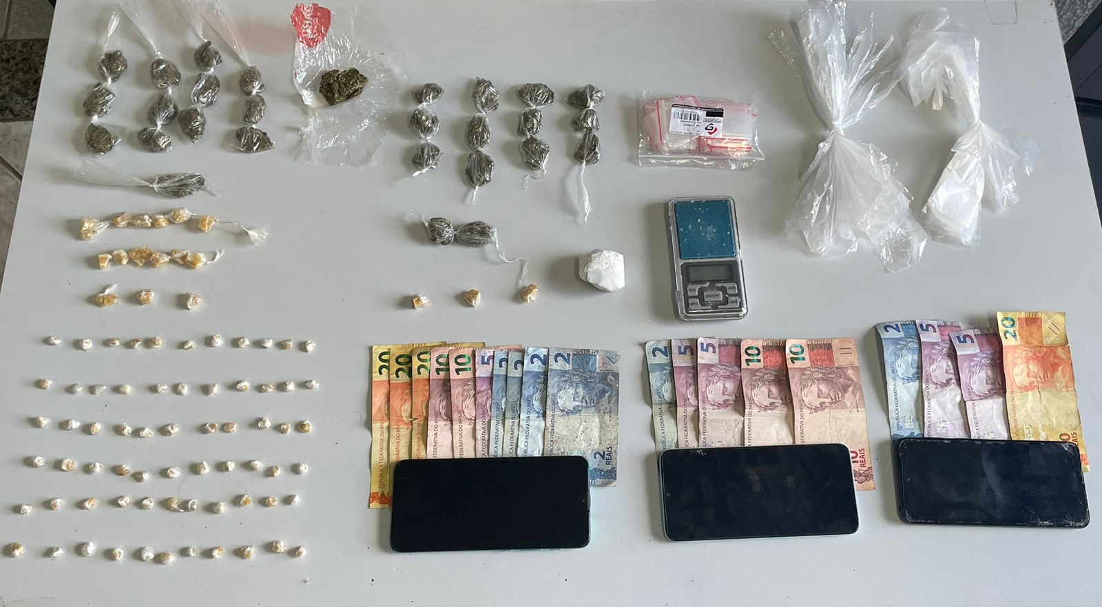 Com as informações obtidas, a PM decidiu abordar os jovens sendo localizado com um deles a quantia de R$ 32,00 e um celular Motorola. Com outro, também foram encontrados R$ 32,00 e um celular Redmi e o terceiro acusado portava a quantia de R$ 93,00 e um celular da marca Motorola.
