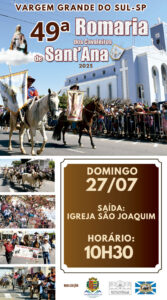 Com data marcada para o próximo dia 27 de julho, último domingo do mês, a tradicional Romaria dos Cavaleiros de Sant’Ana entra em contagem regressiva. Faltando menos de um mês para sua 49ª edição, os preparativos seguem em ritmo acelerado pela Comissão Organizadora, que está empenhada em garantir mais um ano de fé e tradição pelas ruas de Vargem Grande do Sul.