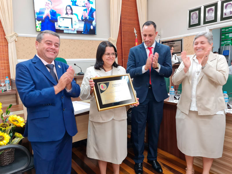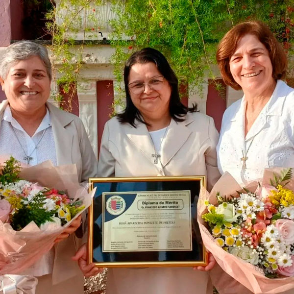 Durante a sessão solene na Câmara Municipal realizada na tarde do dia 5 de julho, sábado, foi entregue à Irmã Aparecida Donizete de Freitas, em reconhecimento à sua vida missionária e contribuição exemplar na área da atividade religiosa e 25 anos de vida consagrada, o Diploma “Dr. Francisco Álvares Florence”. O diploma foi proposto pelo vereador Paulo César da Costa, o Paulinho da Prefeitura (Podemos).